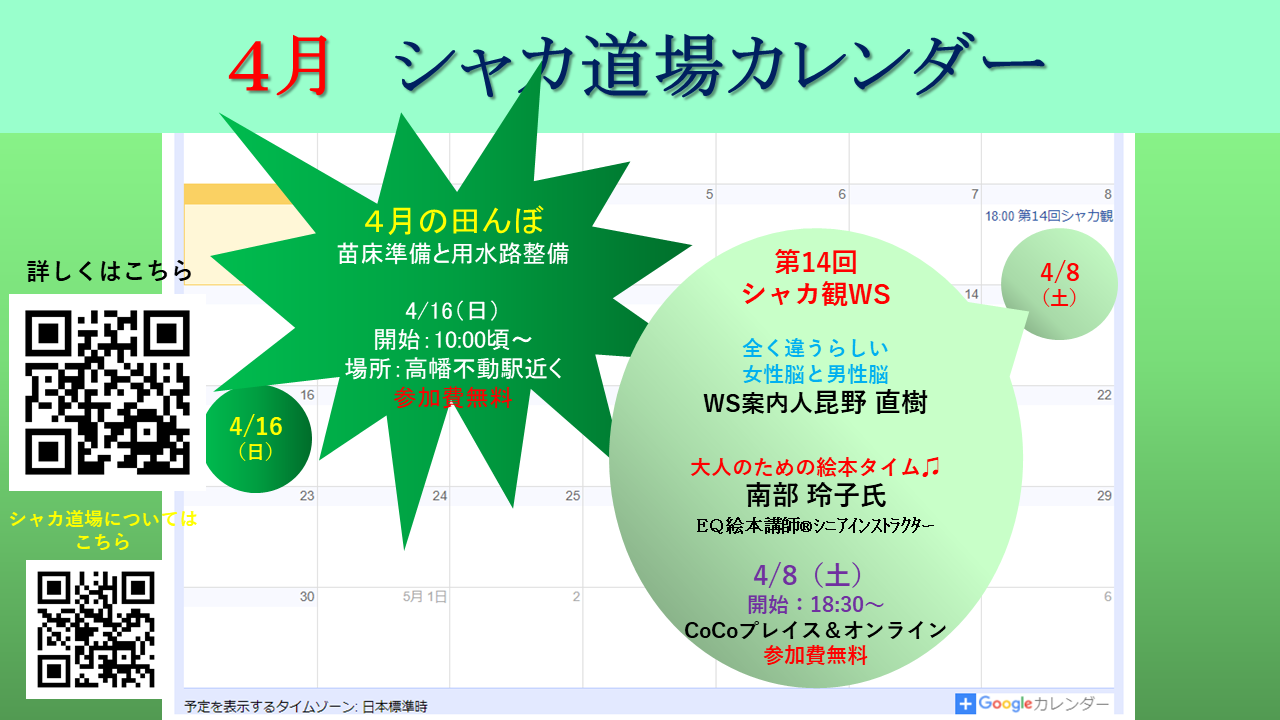 今月のシャカ観WSは4月8日(土)開催となります。